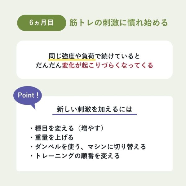 - 6ヵ月:筋トレの刺激に慣れ始める