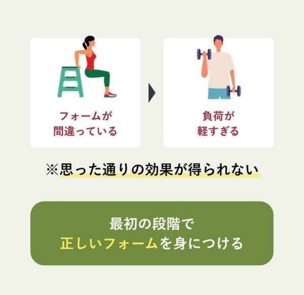 トレーニング時のフォームが間違っていたり崩れたりしていると、狙った部位にアプローチできず、思った通りの効果が得られないことも。