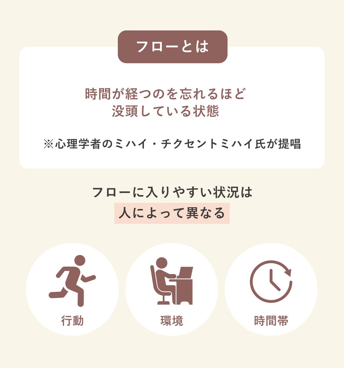心理学者のミハイ・チクセントミハイ氏が提唱した概念で「時間が経つのを忘れるほど 1つのことに没頭し、周りが気にならなくなるような心理状態」のこと。フローに入りやすい行動や環境、時間帯は人によって異なるので、こうすれば絶対にフローに入れるという方法は存在しない。