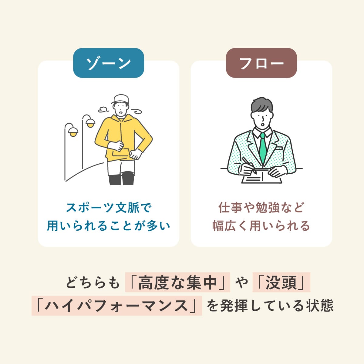 ゾーンは主にスポーツや競技の場面で語られることが多いが、フローはスポーツ以外にも創作活動や仕事などの場面でも表現されることが多い。
