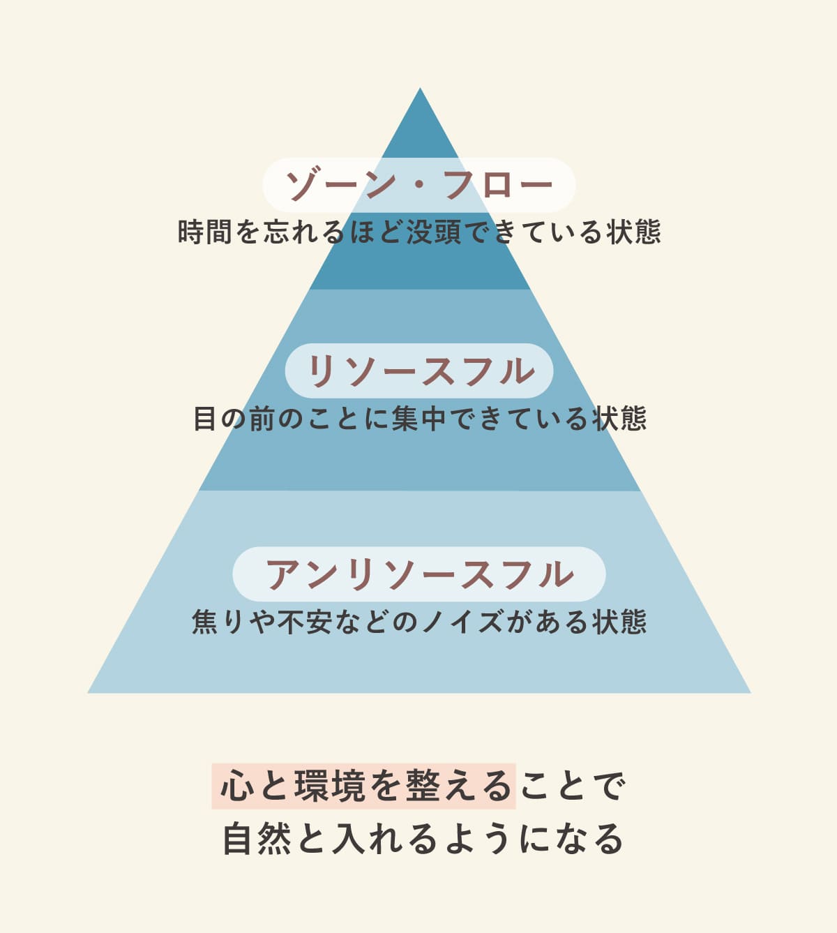 フローは特別な状態ではなく、誰にでも起こりうる「時間を忘れるほど作業に没頭している心理状態」のこと。フローに入ろうと意識して入るのではなく、不安やイライラといった心のノイズを取り除き、心が整った状態(リソースフル)をつくった結果として自然に訪れる。