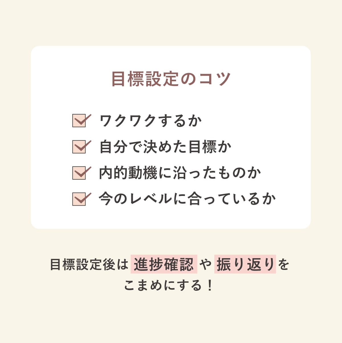 目標設定後は、具体的な数字を用いて進捗を可視化(前に進んでいる感覚)し、定期的な振り返り・フィードバックをおこなうことで、安心して進められる環境を整えることが大切。