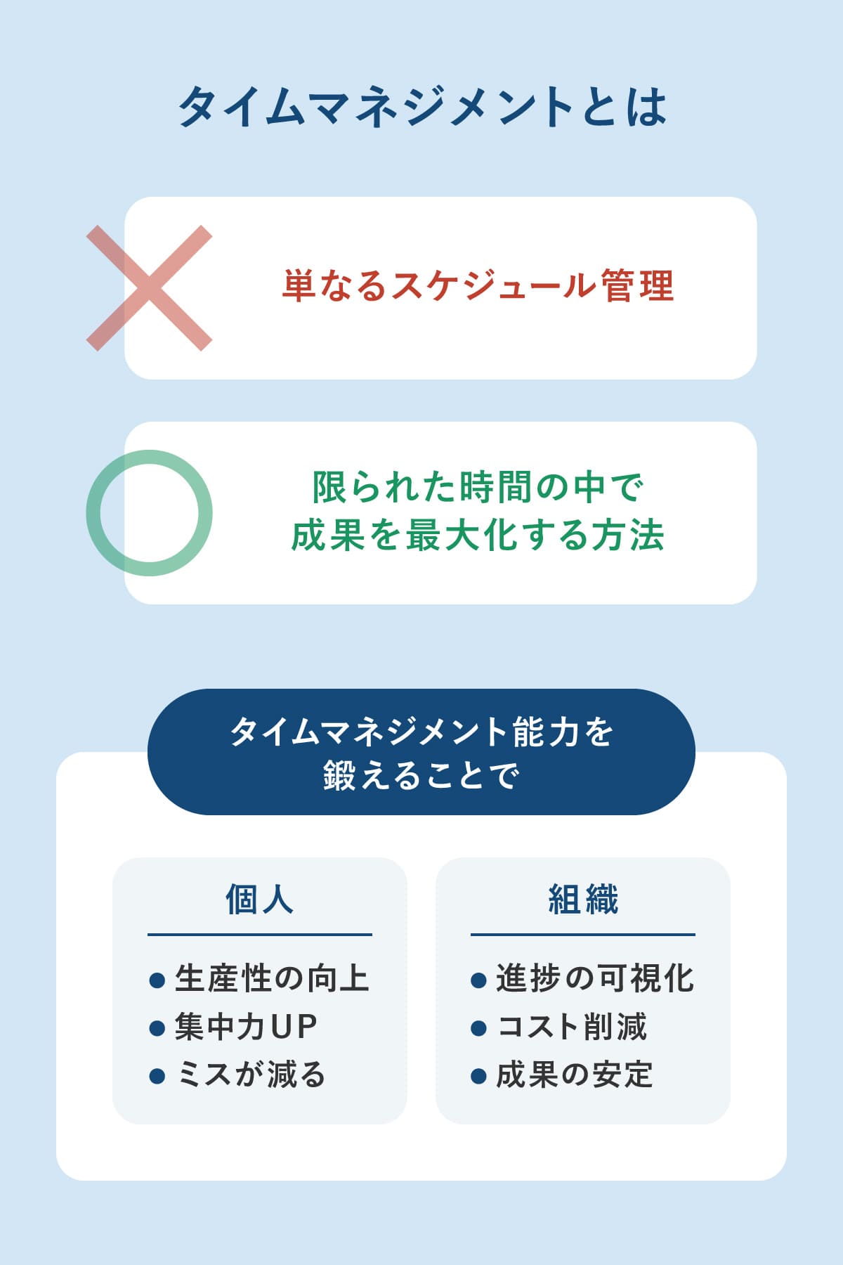 タイムマネジメントとは、単なるスケジュール管理ではなく、限られた労働時間の中でいかに成果を最大化するかという考え方。忙しさに振り回されず、本来やるべきことに集中できる状態をつくることで、効率だけでなく、心理的な余裕を生み出す働き方の土台ともなる。