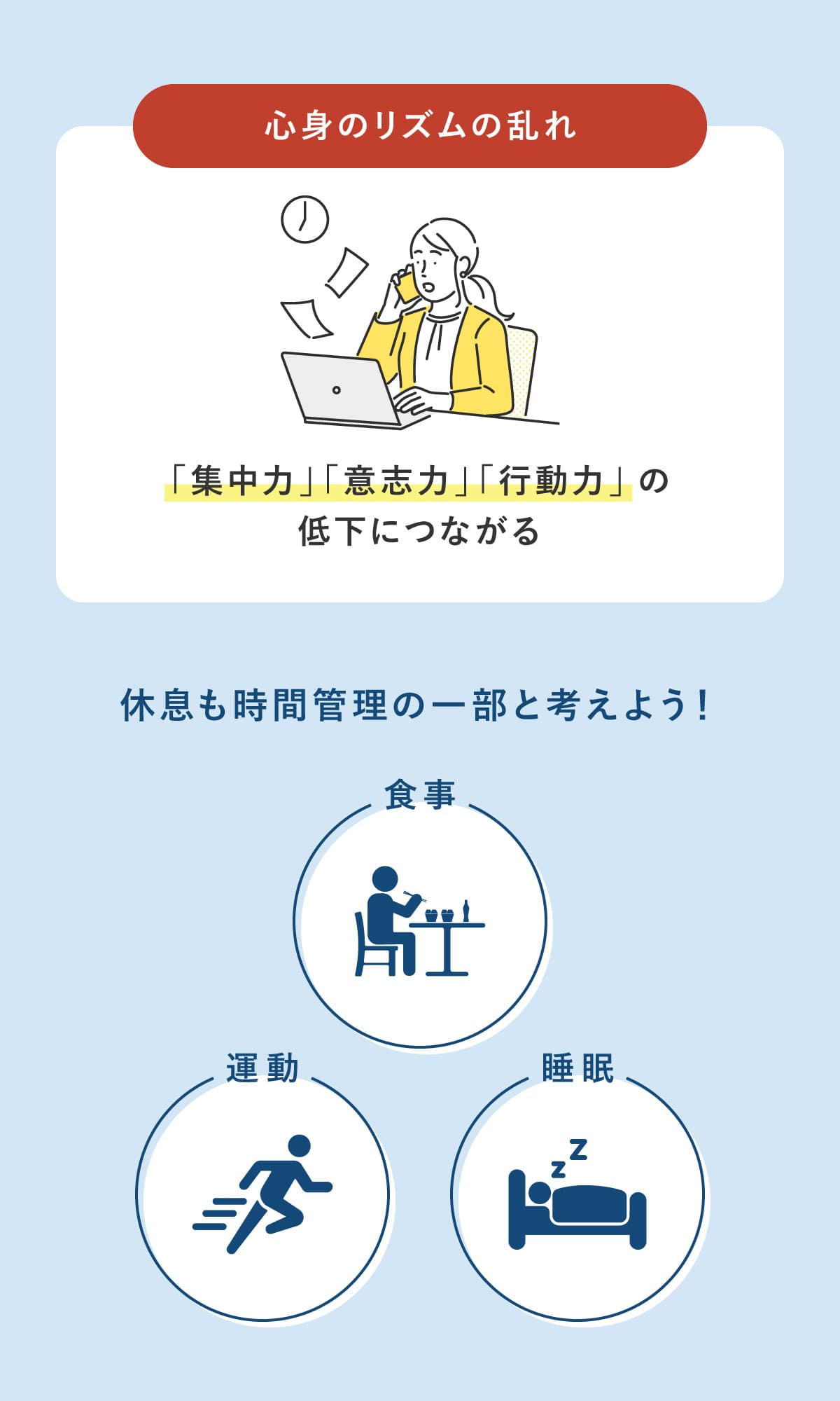 体調が整えば集中力や判断力が向上し、同じ時間でも高い成果を出しやすくなる。休息も時間管理の一部と捉え、意識的にリフレッシュの時間を確保することが重要。