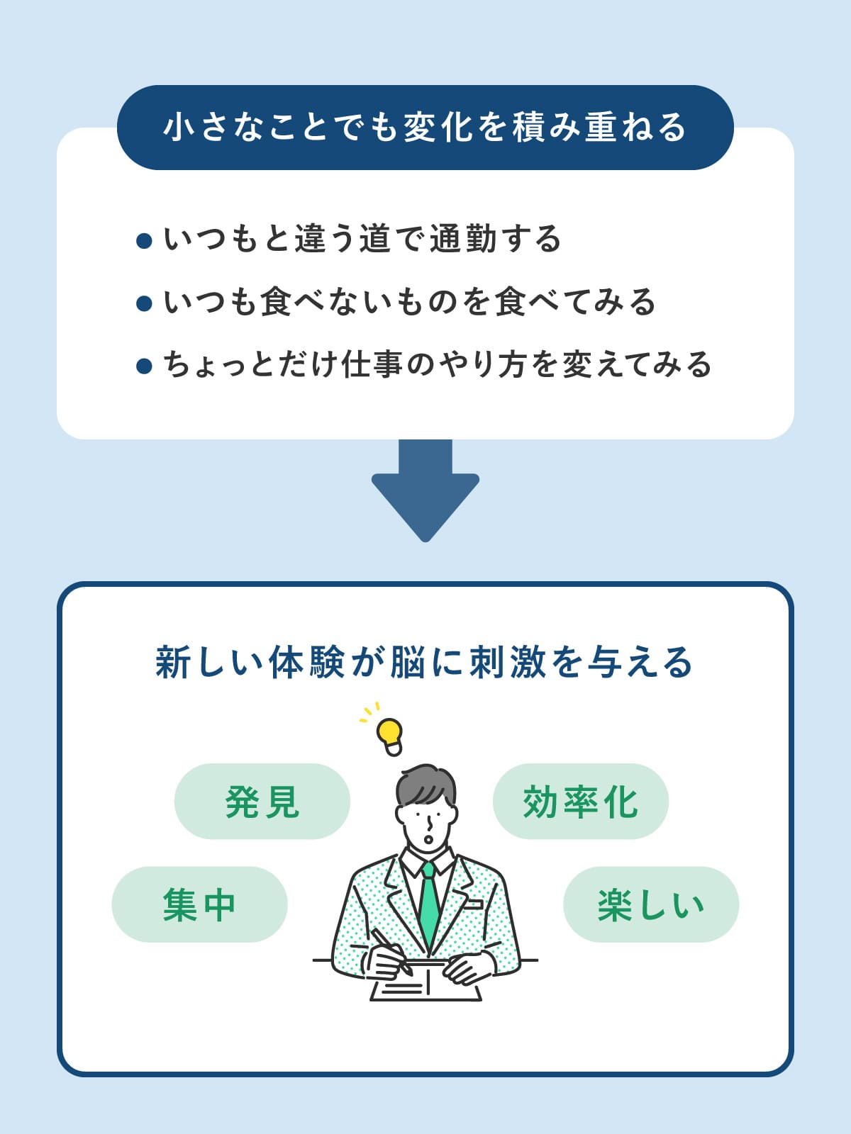 「いつもと違う道で通勤する」「いつも食べないものを食べてみる」「ちょっとだけ仕事のやり方を変えてみる」など、ちょっとした変化でもよいので、できるだけ毎日新しいことをする習慣を身につけよう。