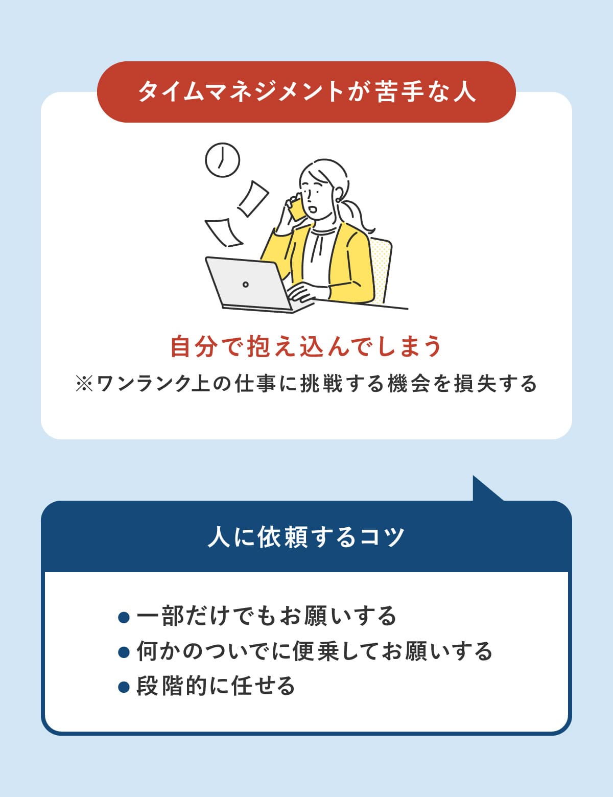 「一部だけでも任せてみる」「何かのついでに便乗してお願いする」など、お互いに負担が少ない方法でお願いしてみるとよい。優先度の低い会議への参加を控える・SNSのチェック時間を制限するなど、やらないことリストを作るのも1つの方法。
