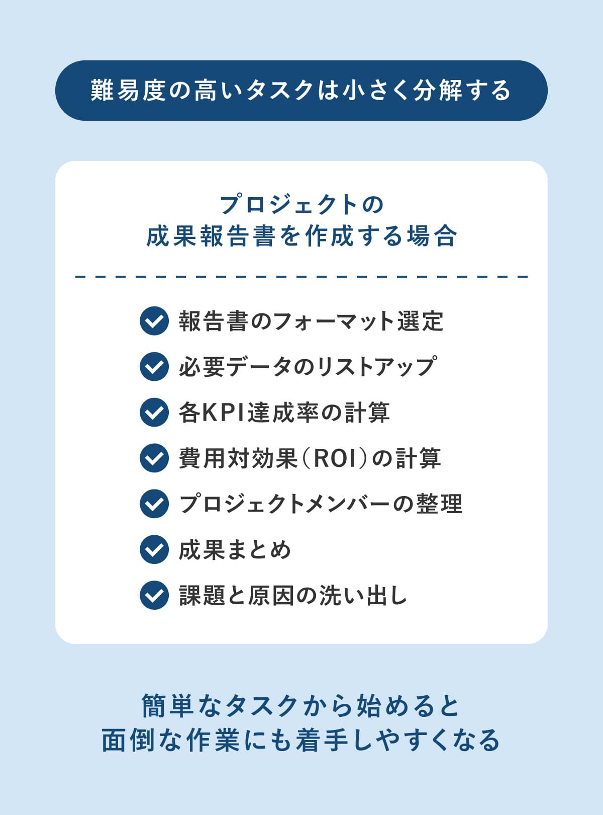 - 嫌な仕事や難易度の高い仕事は小さく分解する