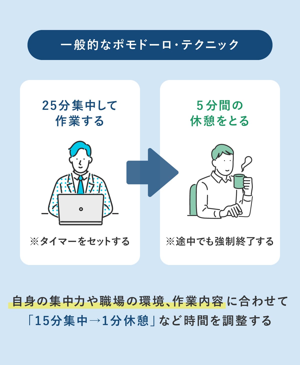 ただし、実際には「25分も集中するのが難しい」「5分も休憩しているとサボっていると思われる」など、活用が難しいケースも。その場合は「15分集中したら1分休憩する」など、自身の環境や集中力、作業内容に合わせて時間を調整するとよい。