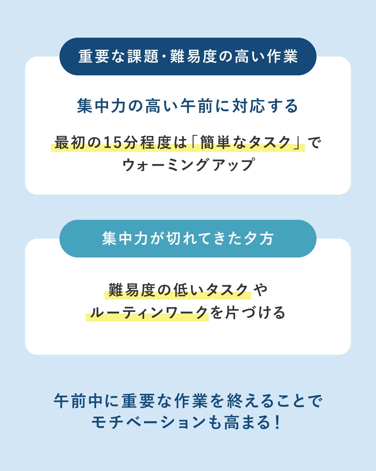 午後から夕方にかけての時間帯は、集中力が低下しやすいため、重要な課題は集中力の高い午前中に終わらせるのが理想。