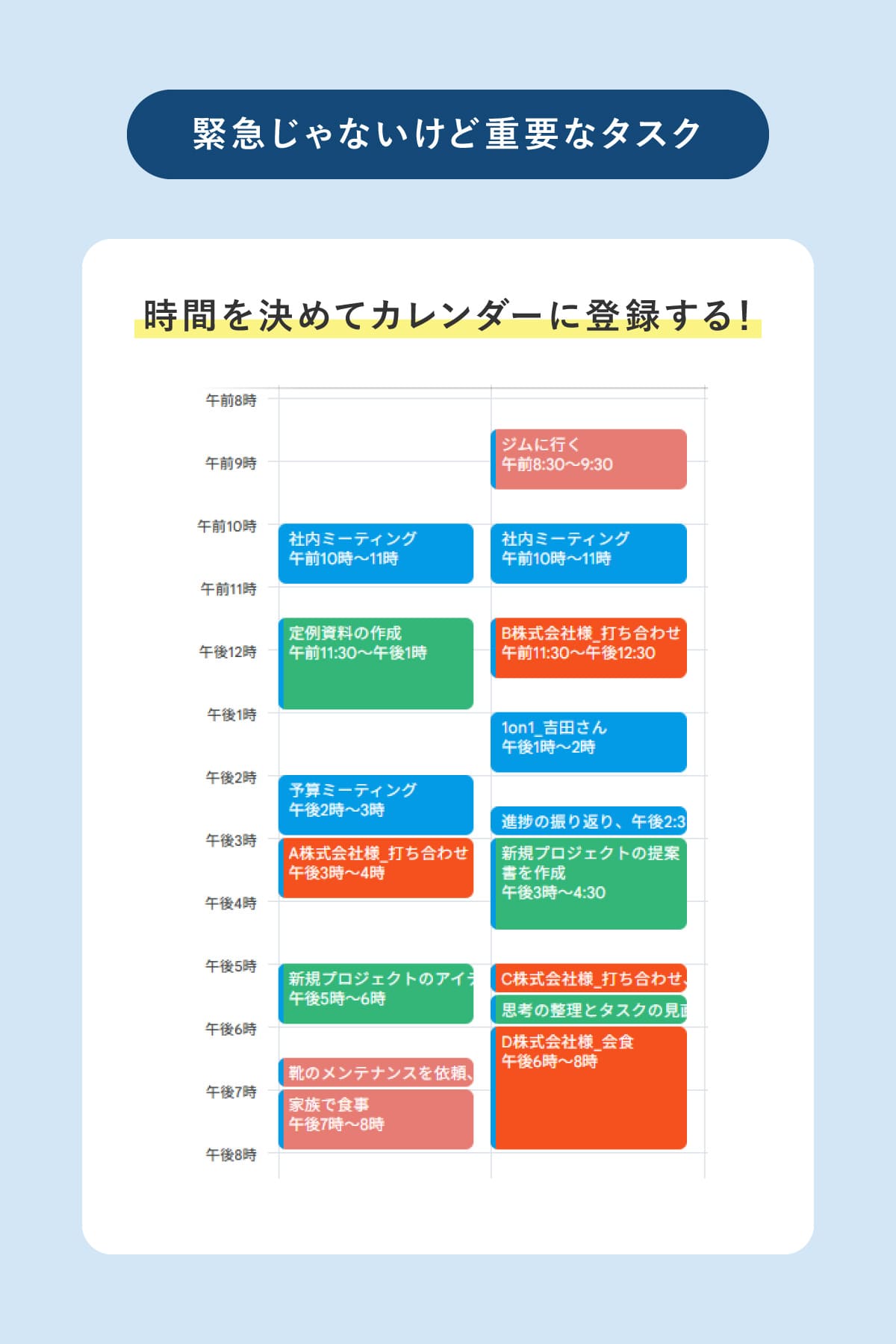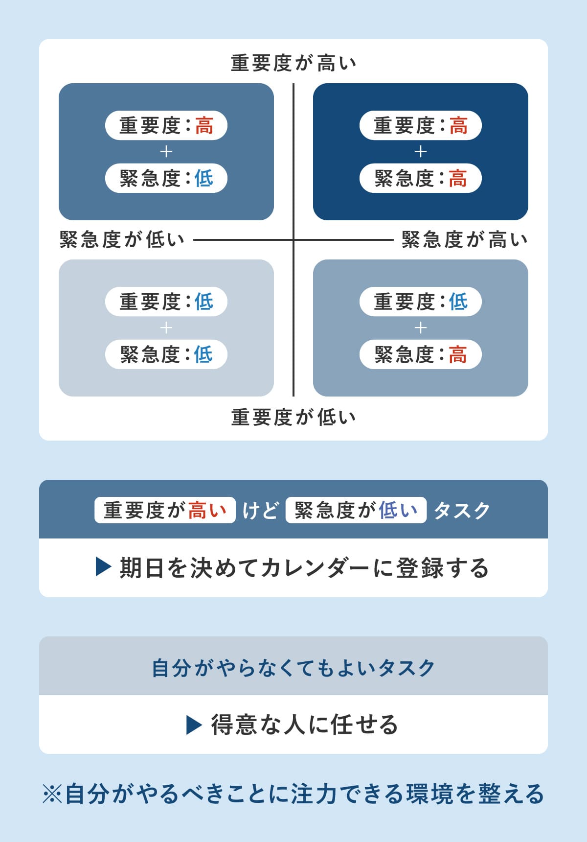 重要度は高いけど緊急度は低いタスクは期日を決めてカレンダーに登録し、自分がやらなくてもよいタスクは得意な人に任せるなど、自分がやるべきことに注力できる環境を整えよう。