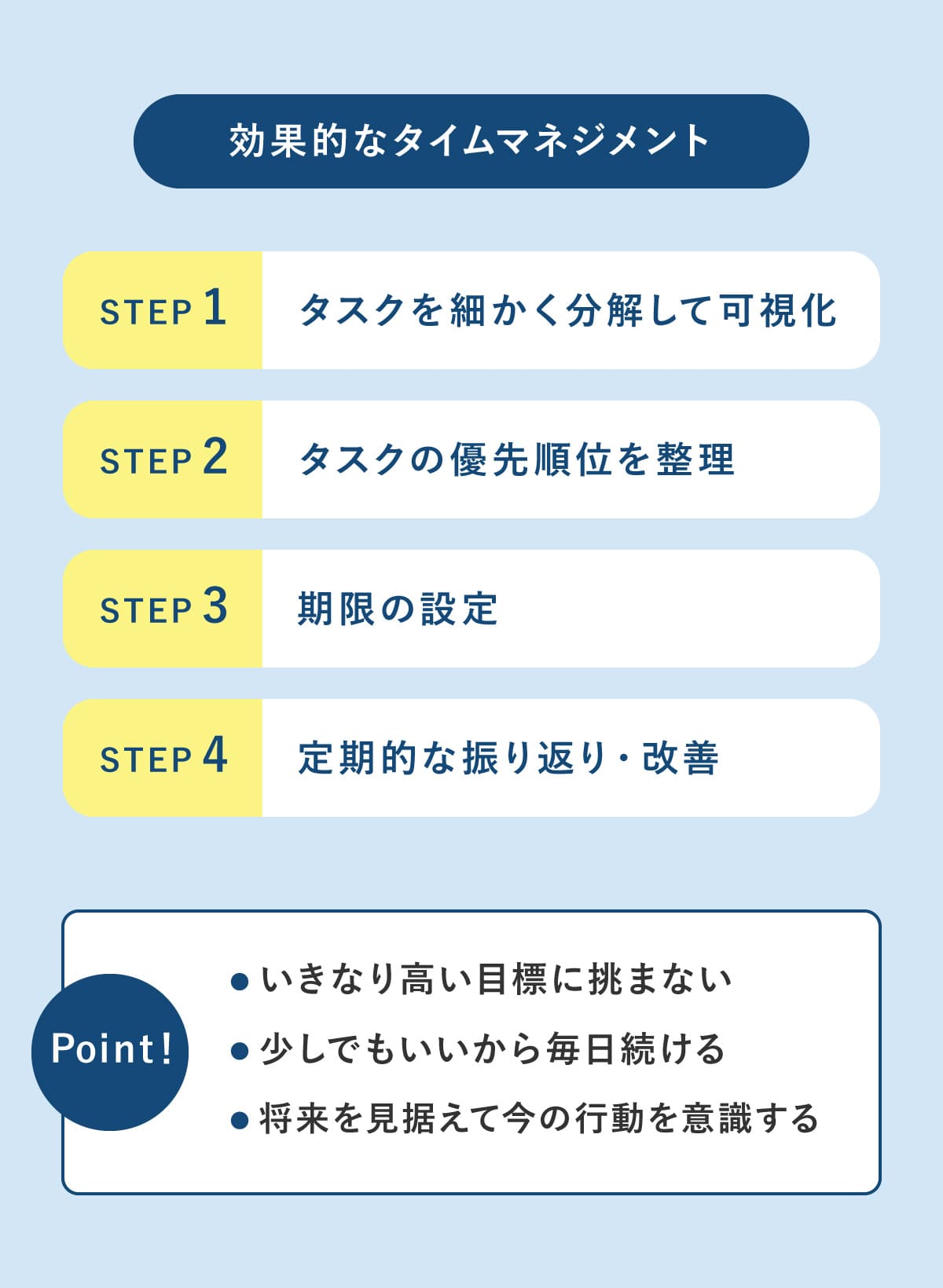 タイムマネジメントは、やって終わりではなく「改善し続ける」ことが大切。現在の進め方が正しいかどうかは、振り返りをしないとわからない。計画通りに進んだこと、うまくいかなかったことを見直し、改善点を探すことが重要。