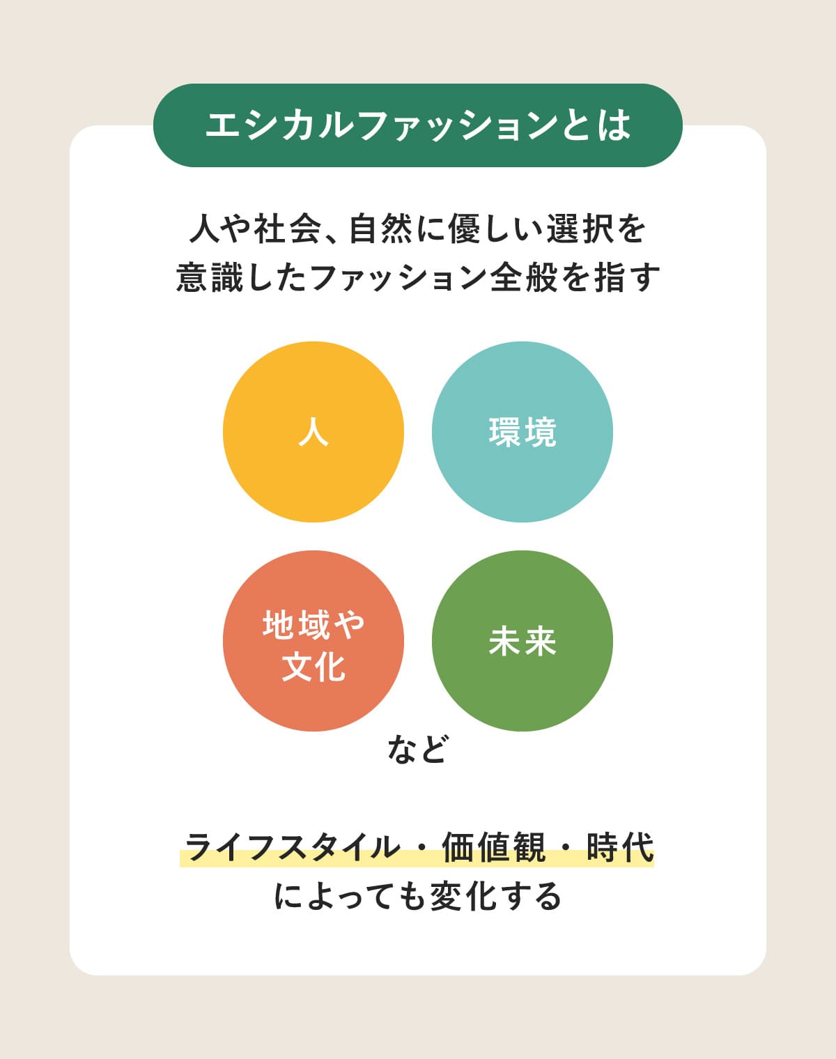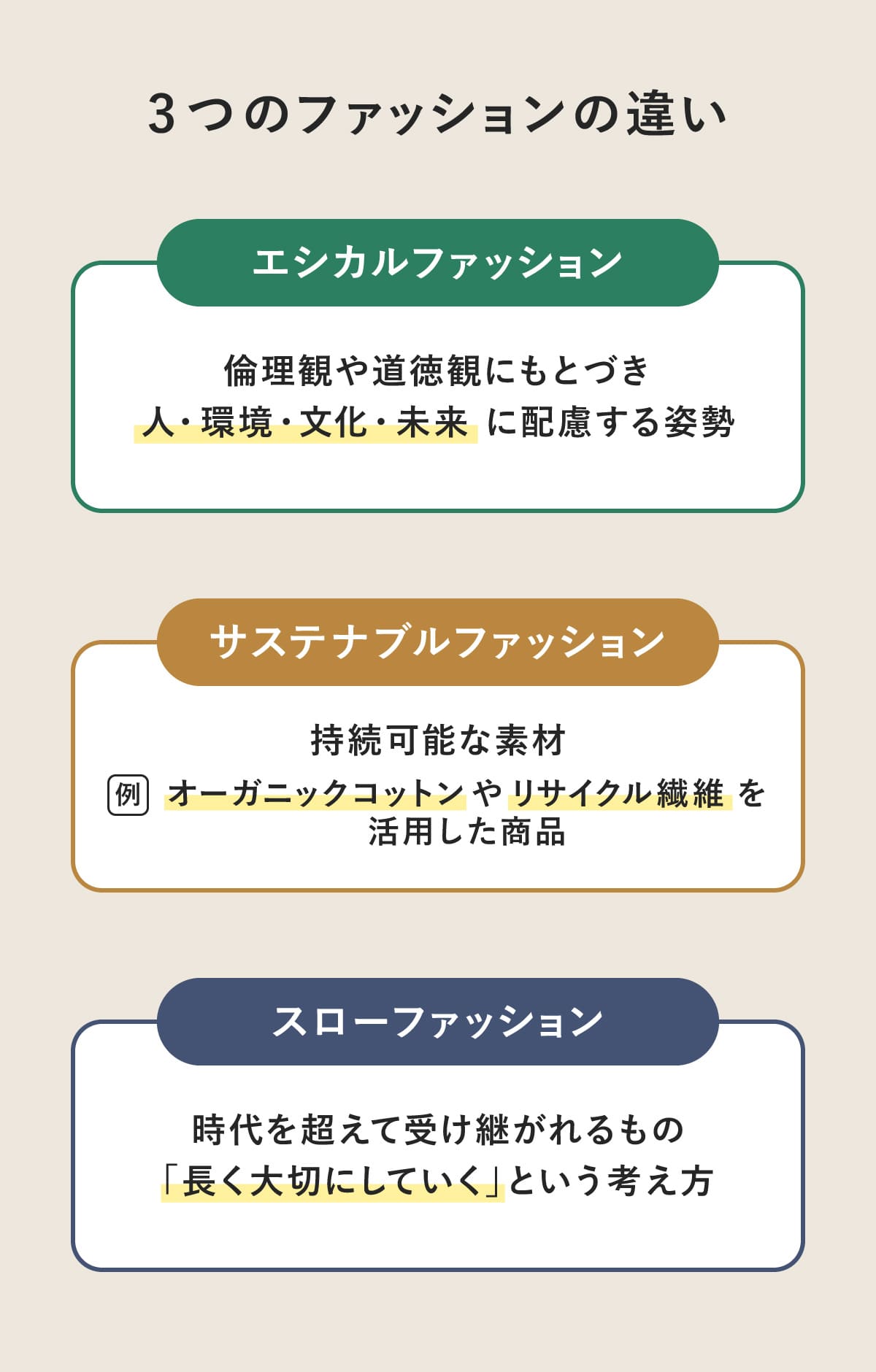 - エシカルファッション:包括的な概念。倫理観や道徳観に基づき、人・環境・文化・未来に配慮する姿勢そのもの。