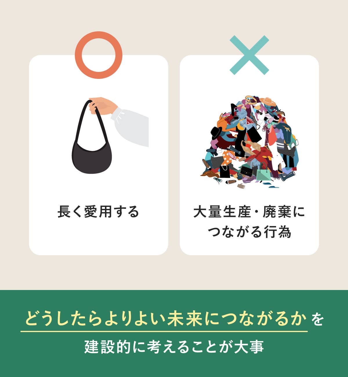 エシカルファッションは「これが正しい」「あれは間違い」と線を引くためのものではない。長く愛用すれば、どんな素材のバッグであろうとエシカルファッションであり、リサイクル素材を使っていても大量生産・大量廃棄につながるなら本質的にはエシカルとは言えない。