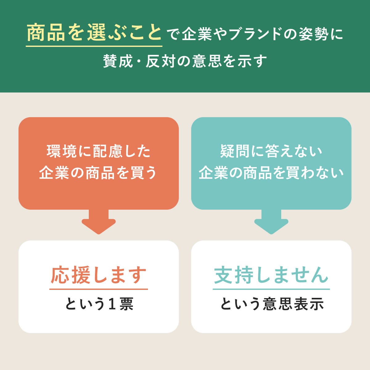 環境に配慮した企業の商品を買えば「応援します」という1票になり、疑問に答えない企業の商品を買わなければ「支持しません」という意思表示になる。