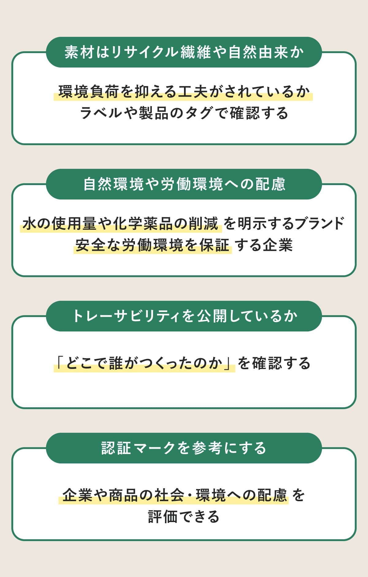 真剣にエシカルファッションに向き合うなら、価格やデザインだけでなく、素材や生産背景、企業の姿勢など、確認すべきポイントは多岐にわたる。