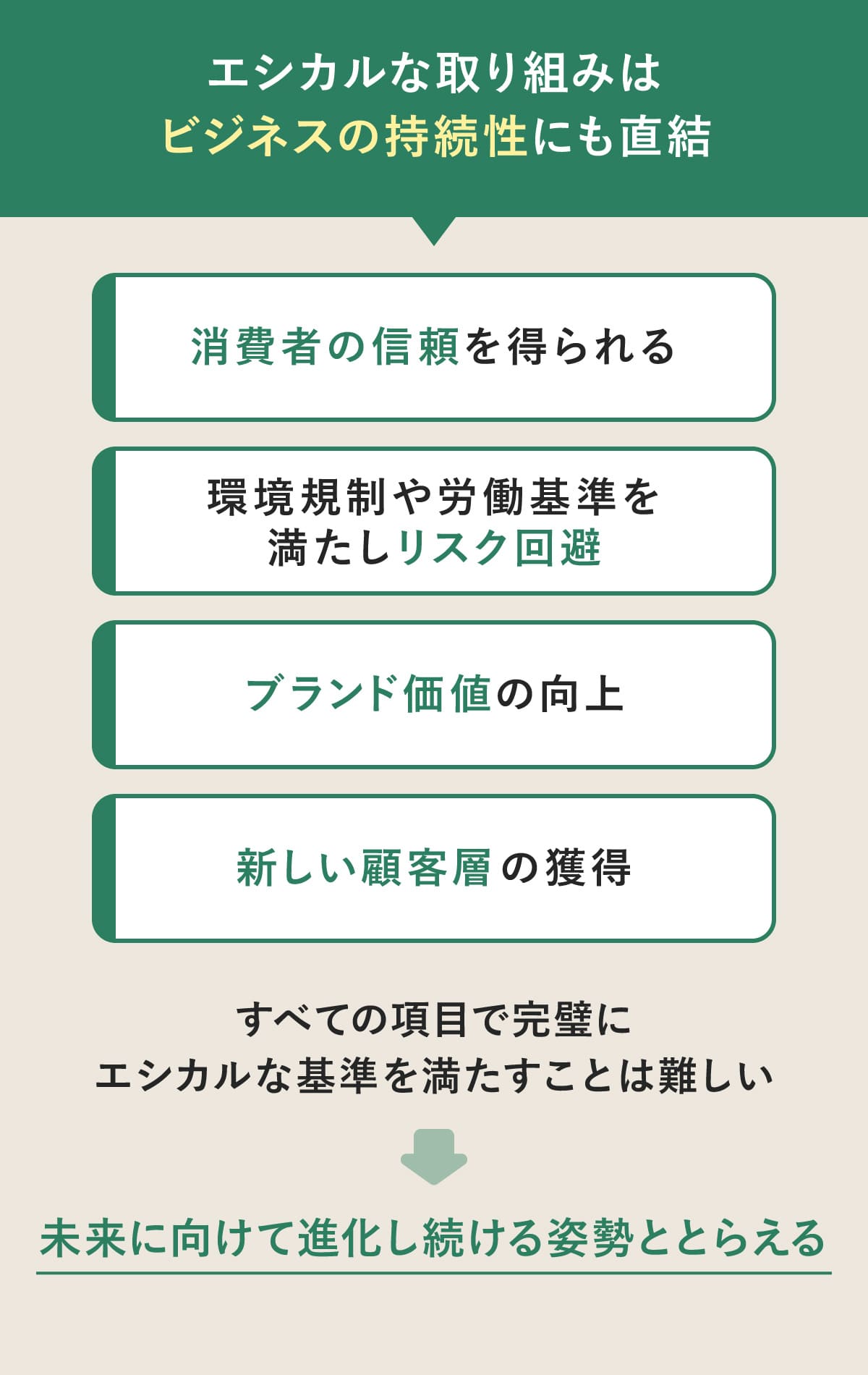 エシカルな取り組みは、単なる社会貢献ではなくビジネスの持続性にも直結する。消費者の信頼を得られるだけでなく、環境規制や労働基準を満たすことでリスク回避にもつながる。さらに、ブランド価値の向上や新しい顧客層の獲得といった利益面のメリットも大きい。