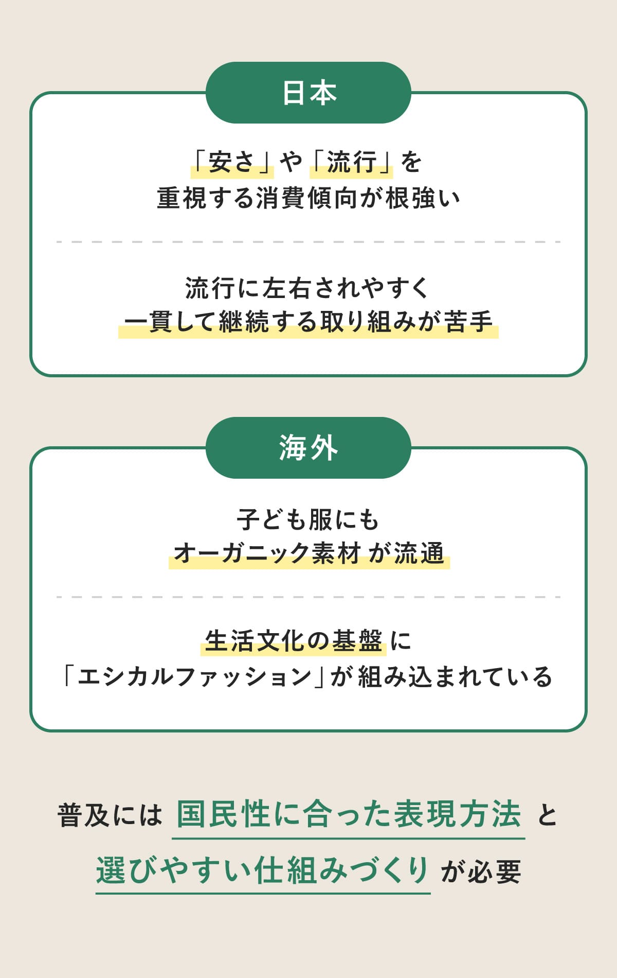 日本は一方で、大量生産ブランドが浸透。安価で均一な衣服が日常となり、エシカルな選択肢が育ちにくい環境にある。国民性として「人と違うことを避ける傾向」があり、エシカルな服を選ぶことが「浮いてしまう」行動として捉えられる場合がある。