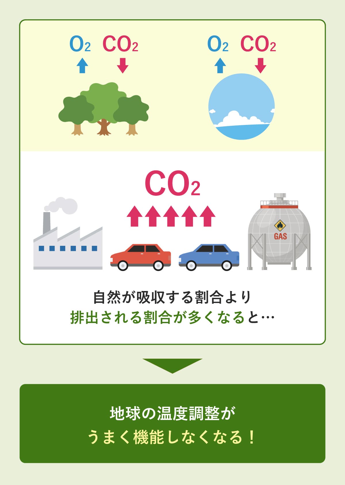 気候変動の原因となる温室効果ガスの約90%がCO2(二酸化炭素)。CO2の排出量が増加して大気中のCO2濃度が濃くなると、本来は大気の外に放出される熱が蓄積され、地球の温度調整がうまく機能しなくなる。とはいえ、CO2自体が悪者というわけではなく、昔から一定の濃度で自然界に存在していた。