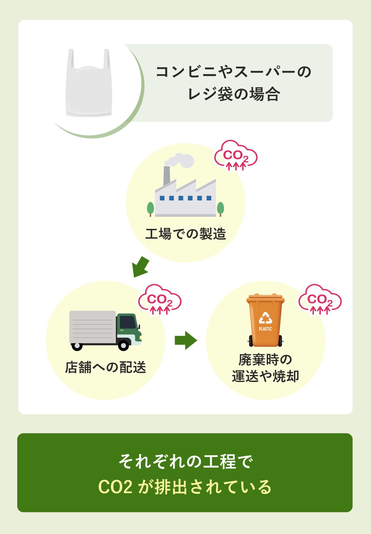 たとえば、コンビニで購入するレジ袋の場合、「工場で製造過程」「工場から店舗への輸送」「廃棄時の運送や焼却」の工程でCO2が排出される。