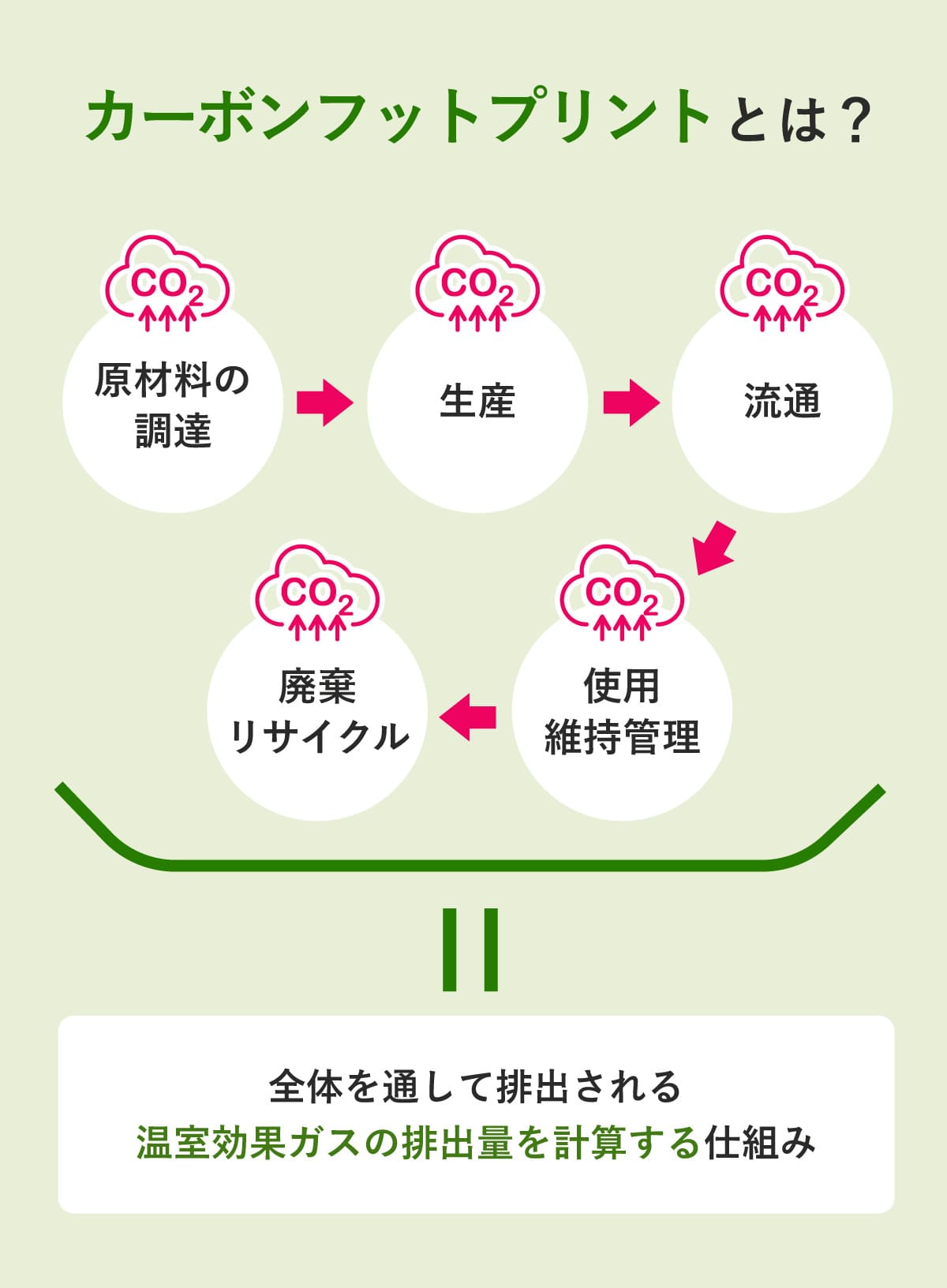 すべての工程を通して排出された温室効果ガスの排出量(CO2換算)を計算する仕組みは「「カーボンフットプリント」と呼ばれる。日本では義務化されていないが、自主的に取り組んでいる企業や業界団体も存在する。