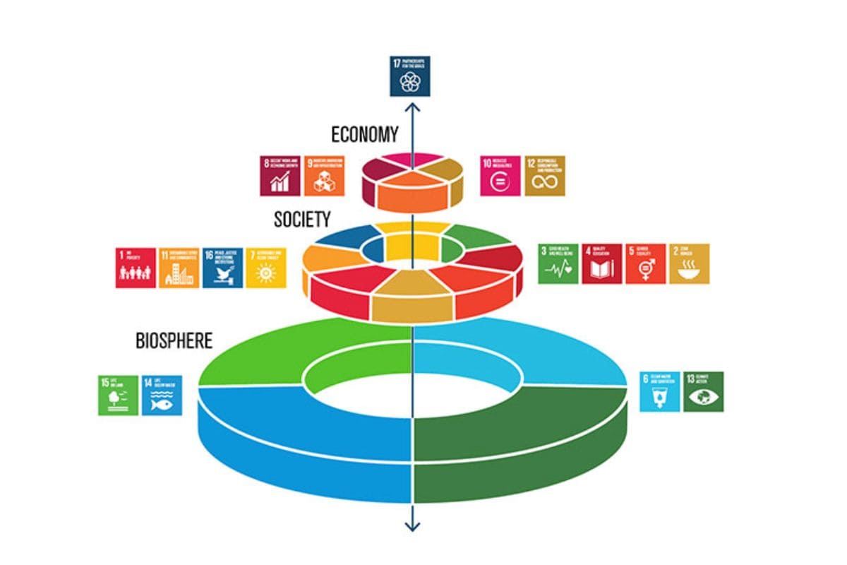 1番下の土台部分には地球の「環境」があり、その上に「人々の暮らし(社会)」、さらにその上に「経済」が重なっている。これは優劣や重要度を表すものではないが、土台となる「環境」の部分が崩れると、人々の健康や暮らし、さらには経済活動にも深刻な影響を及ぼすことになる。