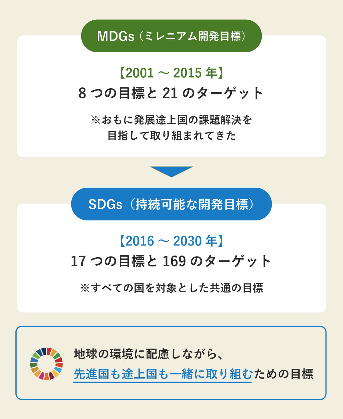 「SDGs(持続可能な開発目標)」は、2015年に国連サミットで決められた、2030年までに世界全体でよりよい未来をつくるための目標。それ以前の2000年から2015年までは「MDGs(ミレニアム開発目標)」という国際目標が存在しており、おもに発展途上国の課題解決を目指して8つの目標に取り組んできた。