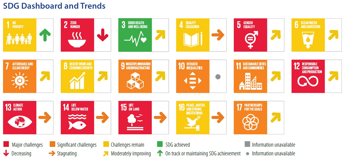 ※緑が「達成済み」、黄色が「課題が残る」、オレンジが「重要な課題がある」、赤が「深刻な課題がある」