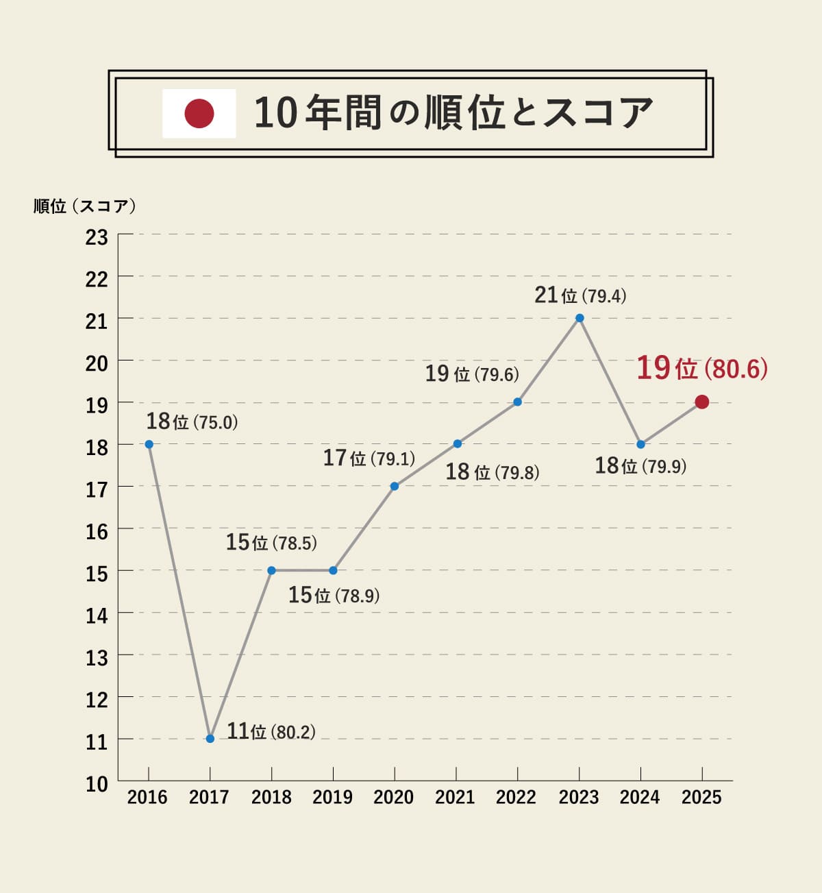 「Sustainable Development Report 2025(SDGsの報告書)」が公表している日本の目標達成度ランキングは167カ国中19位で、ここ数年はほぼ横ばいで推移している。