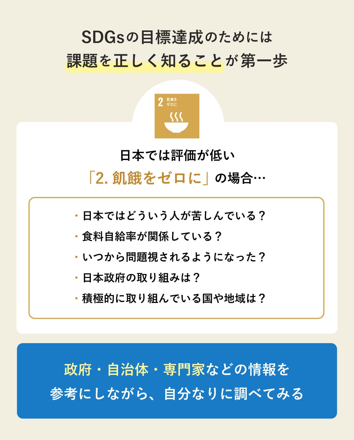 だからこそ1つの問題だけを見るのではなく、社会全体の仕組みに目を向けることが重要。日本では評価が低い「2.飢餓をゼロに」を例にすると、日本全体で食料が不足しているわけではなく、家庭の経済格差で「食料が行き届かない世帯がある」というのが大きな課題。