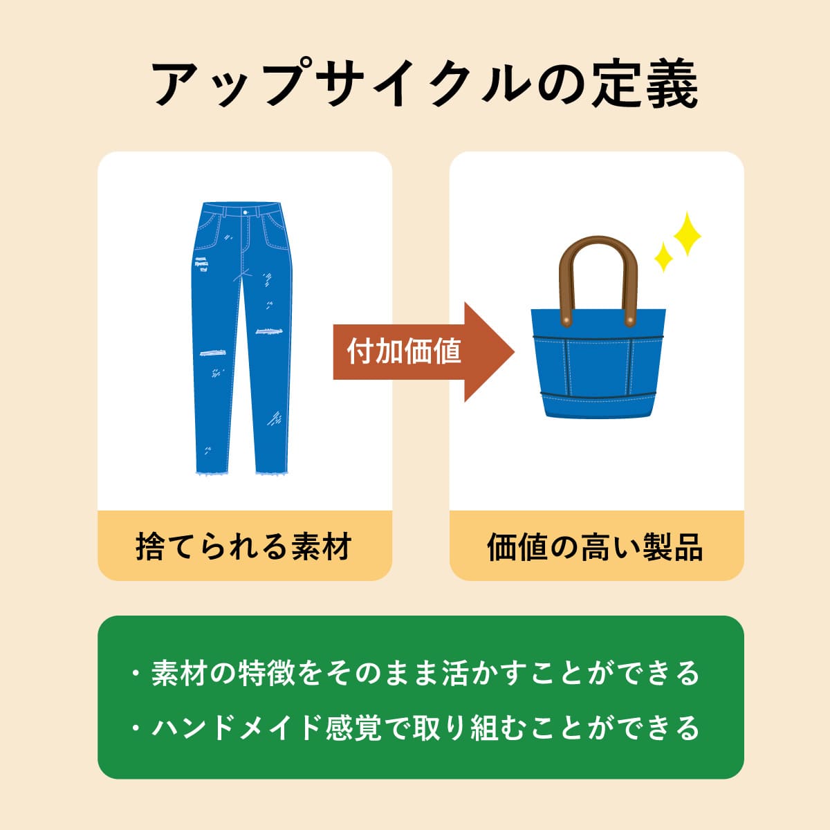 | アップサイクル | 捨てられるものに付加価値をつけて新しい価値を持つ製品として再生。原料や材料に戻すのではなく、製品の素材をそのまま活かす | デニムからトートバッグにする |