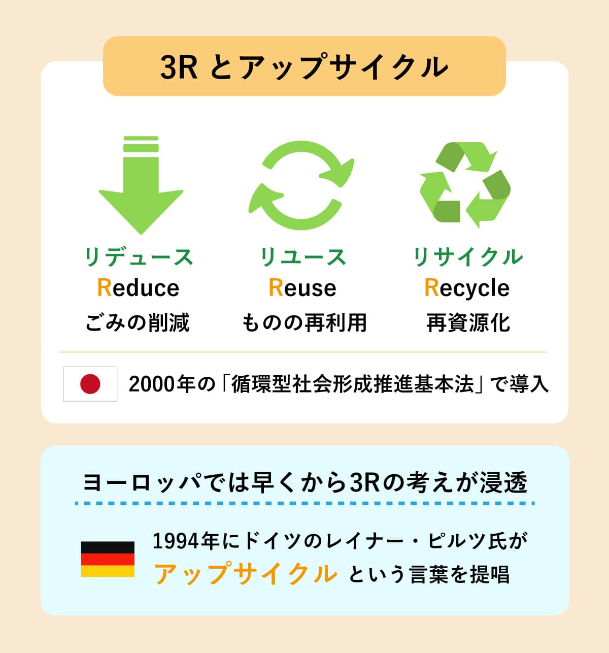 こうした流れの中、1994年にドイツのレイナー・ピルツ氏が「アップサイクル」という言葉を提唱したのが始まりとされている。日本では3Rが定着したあと、リサイクルに出すにはまだ早いと感じる物に対する新たな選択肢として、アップサイクルという言葉が徐々に普及してきた。