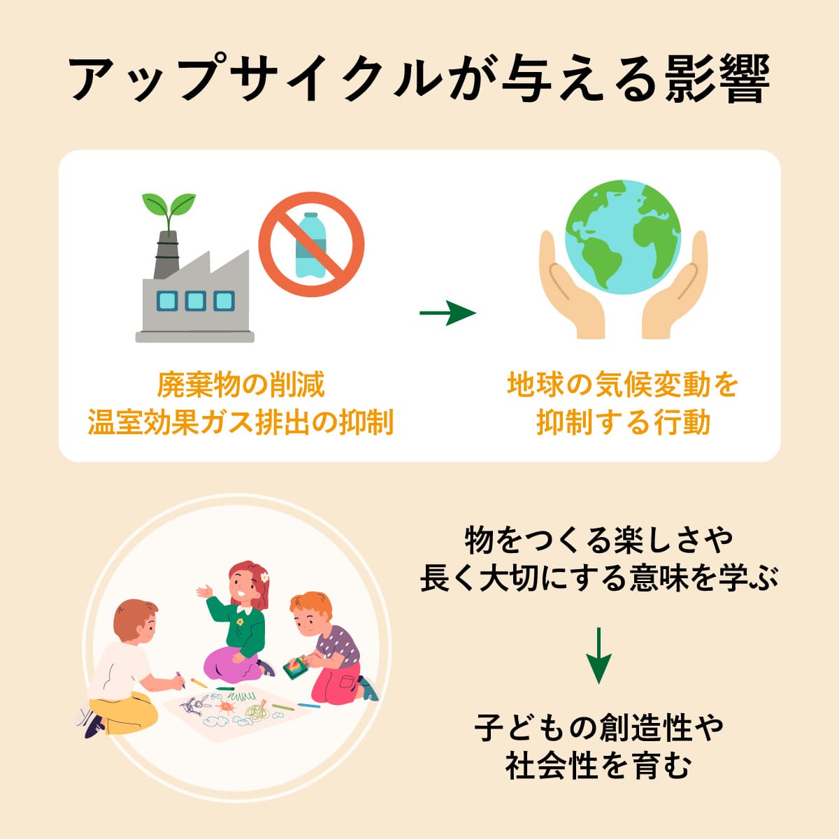 アップサイクルが地球環境に与える影響として「ごみの削減」や「焼却場問題の解決」といった直接的なメリットに加え、「物を大切にする意識を養う」「活動を通じたコミュニティの形成やウェルビーイングの向上」といった社会的な効果も注目されている。