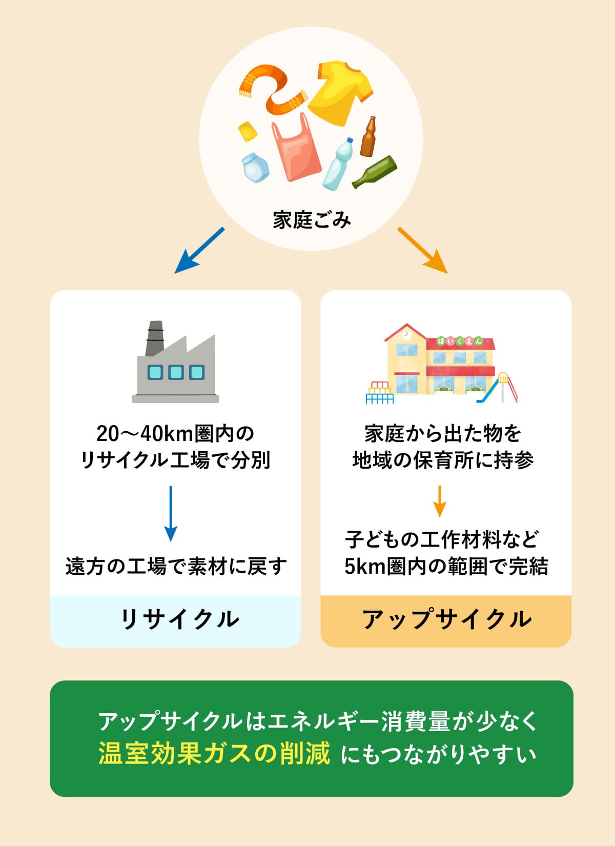 リサイクルの場合、家庭から出た廃棄物を20~40km圏内のリサイクル工場で分別し、さらに遠方の工場で素材に戻すのが一般的な流れ。一方でアップサイクルは、家庭から出た物を地域の保育所に持参して、子どもの工作の材料にするなど、5km圏内の狭い範囲で完結することが多い。