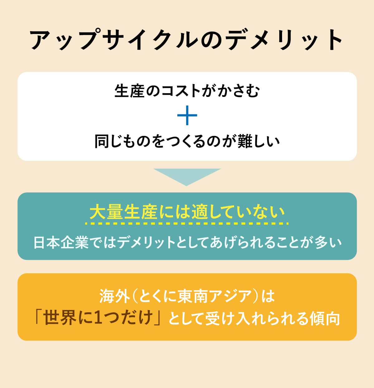 一方、海外(とくに東南アジア)では「世界に1つだけ」として受け入れられる傾向がある。そういった意味では、日本系企業よりも外資系企業のほうが、アップサイクルへの取り組みに理解を得やすい傾向がある。
