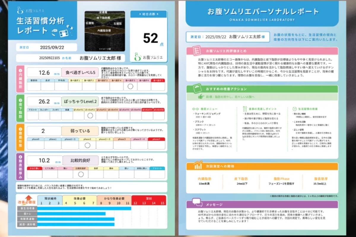 小熊:「お腹ソムリエ®」は、健康診断でも使われている超音波(エコー)を用いて、お腹の脂肪や筋肉の状態をその場で映し出す体験型サービスです。可視化した情報をもとに、生活習慣分析レポートとして質や量を点数化し、わかりやすく評価しています。