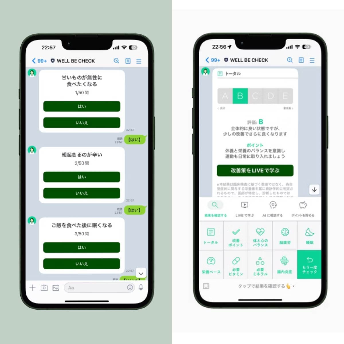 「マインド・栄養・運動・睡眠・ストレス」という健康の5本柱を包括的に見られる仕組みが日本にはほとんどありません。そこで未病のビッグデータを集めるために、LINEで健康状態を数値化できる「WELL BE CHECK®」というサービスを開発しました。