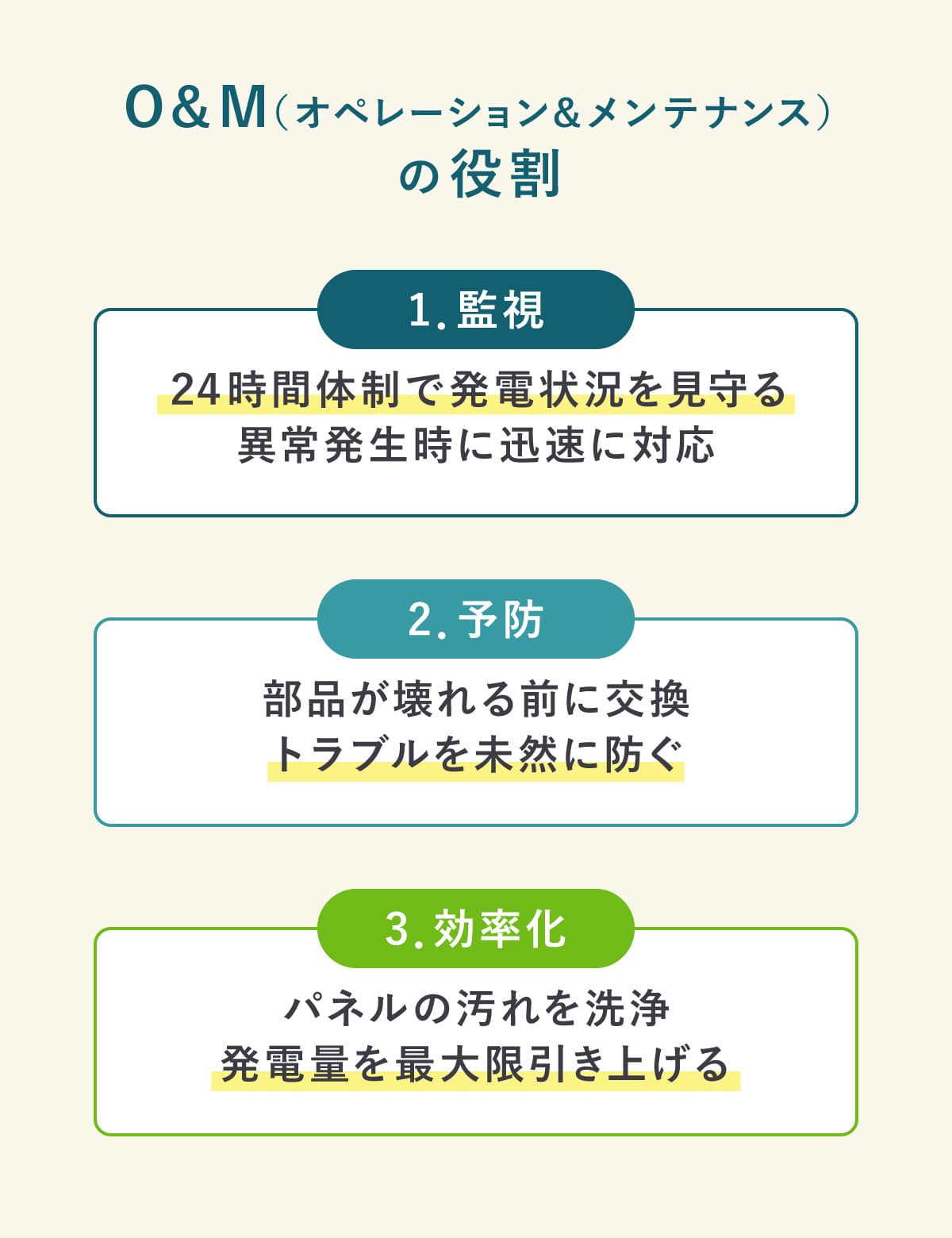 1つ目は監視。24時間体制で発電状態を見守り、止まっていたらすぐに駆けつける。2つ目は予防。部品が壊れる前に交換して、トラブルを未然に防ぐ。そして3つ目は効率化。パネルの汚れを洗浄したり、設備自体を交換したりして発電量を最大まで引き上げるんです。
