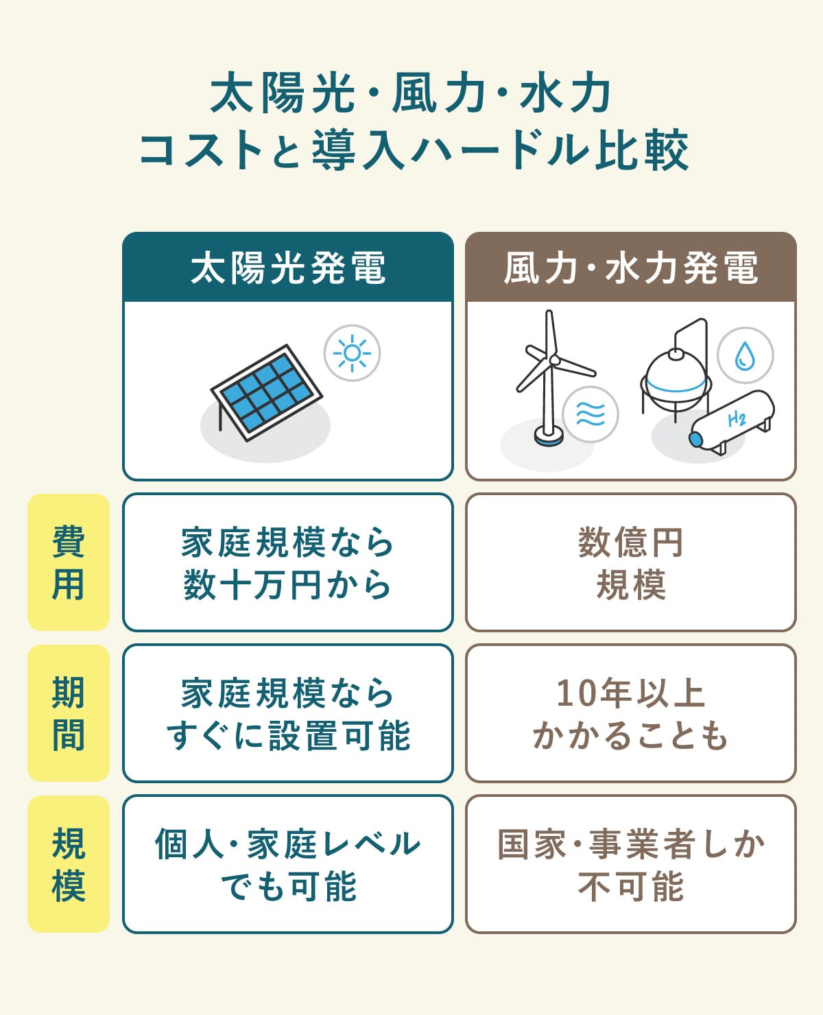 同じ再生可能エネルギーでも、太陽光・風力・水力はどう違う?