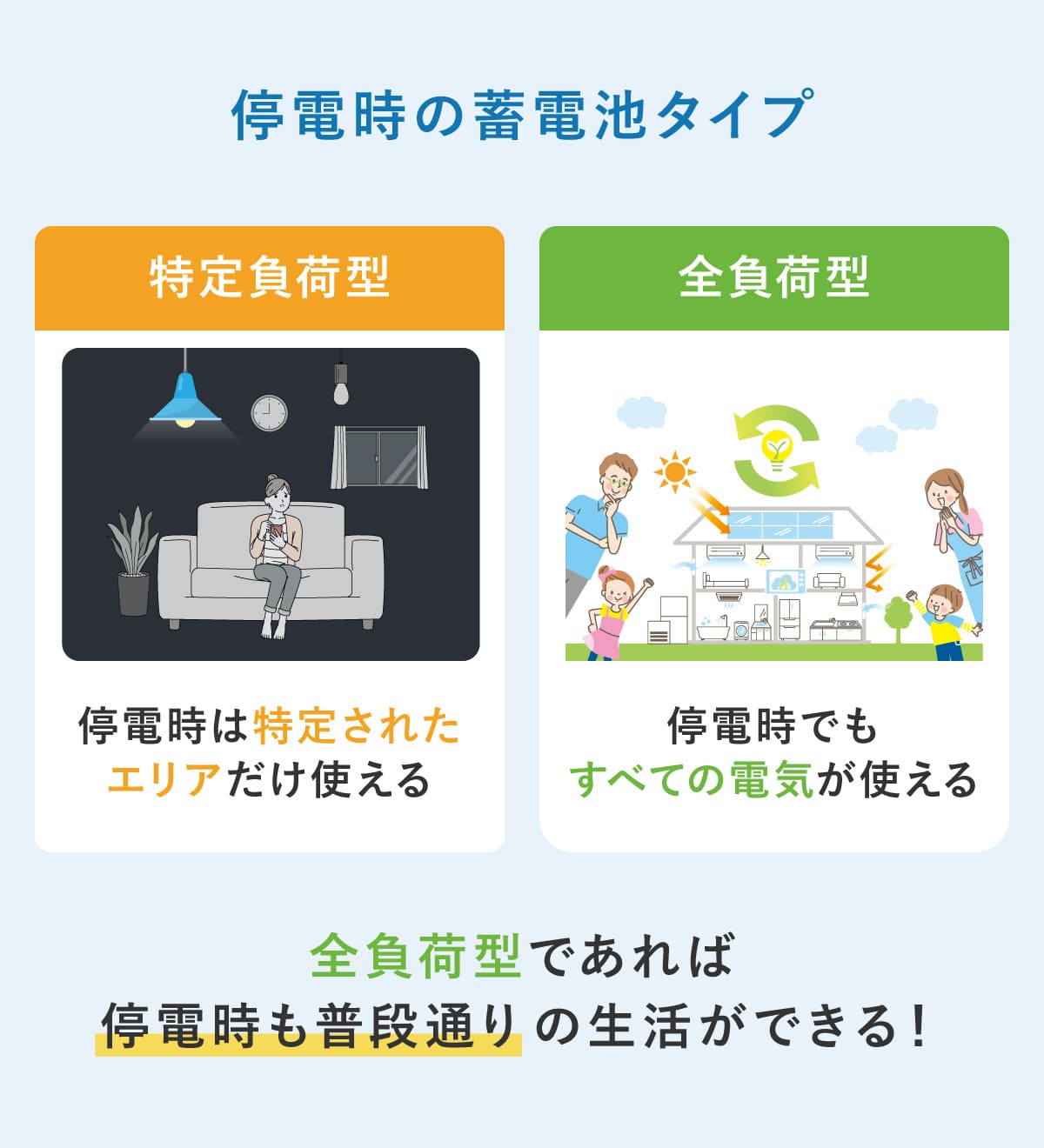 特定負荷型だと停電したときに冷蔵庫はつくけど、お風呂は沸かせない、リビング以外は真っ暗という状態になります。これでは生活の質がガクンと落ちてしまいますよね。