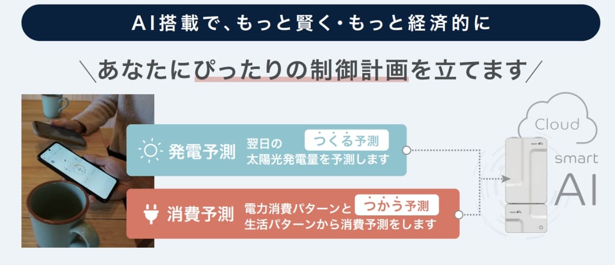 手塚さん:ええ。そして蓄電池だけでなく、太陽光発電の制御技術も進化しています。それが当社のスマートAIです。
